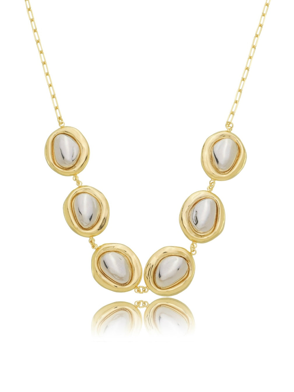 This stunning two-tone gold freeform necklace features a unique design that beautifully blends warm yellow gold with cool white gold. The freeform shapes create an organic, fluid look, making it a versatile piece that can elevate both casual and formal outfits. Its polished finish reflects light beautifully, adding a touch of elegance and sophistication. Perfect for making a statement, this necklace is an ideal accessory for those who appreciate modern artistry in their jewelry.