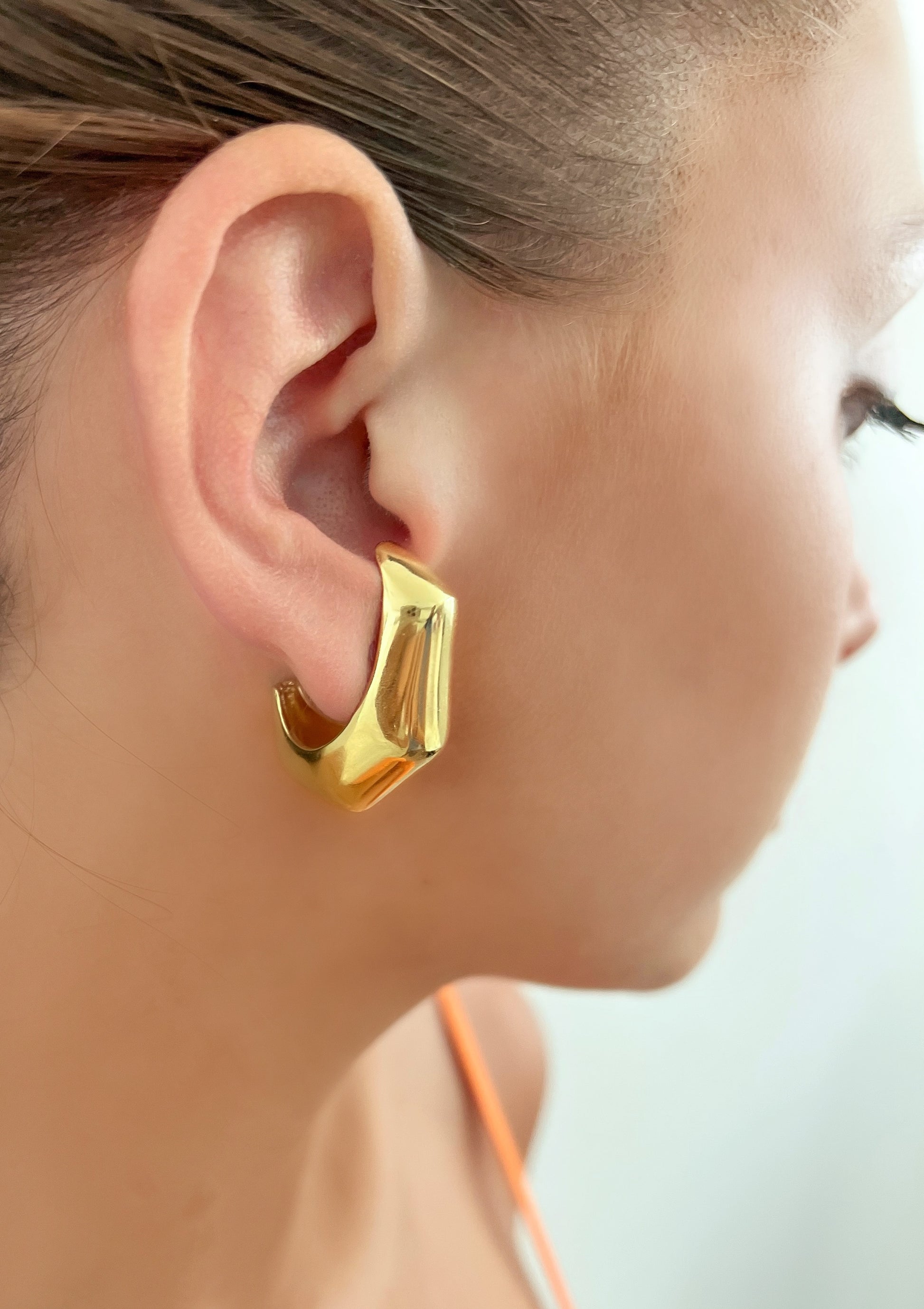 These large chunky gold earrings are anything but simple. Their innovative shape emulates a “hook” that grabs your ear lobes from top to bottom. With their intricate, bamboo-like design, they add a touch of texture to any outfit. Wear them with a flowy sundress and sandals for a beachy vibe or pair them with a sleek updo and a blazer set for a more sophisticated look. These bold earrings are handmade and hand bathed in 18k gold by artisans in Brazil.