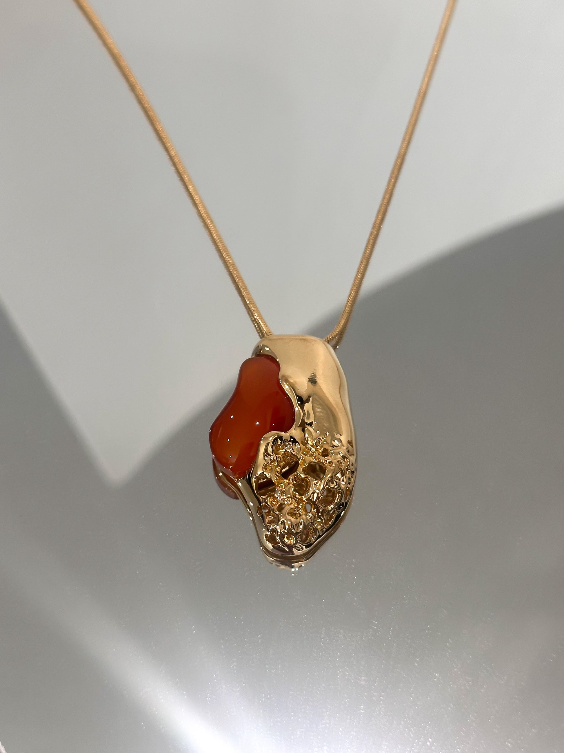 The Caramel Luxor necklace is an elegant fusion of organic form with classic elegance. It features a fluid, sculptural gold silhouette accented by a natural Brazilian Red Agate stone resulting in a fashion forward editorial look serving classic but cutting-edge elegance. The necklace has a fully adjustable mechanism allowing it to be worn as a choker all the way to a 26-in necklace