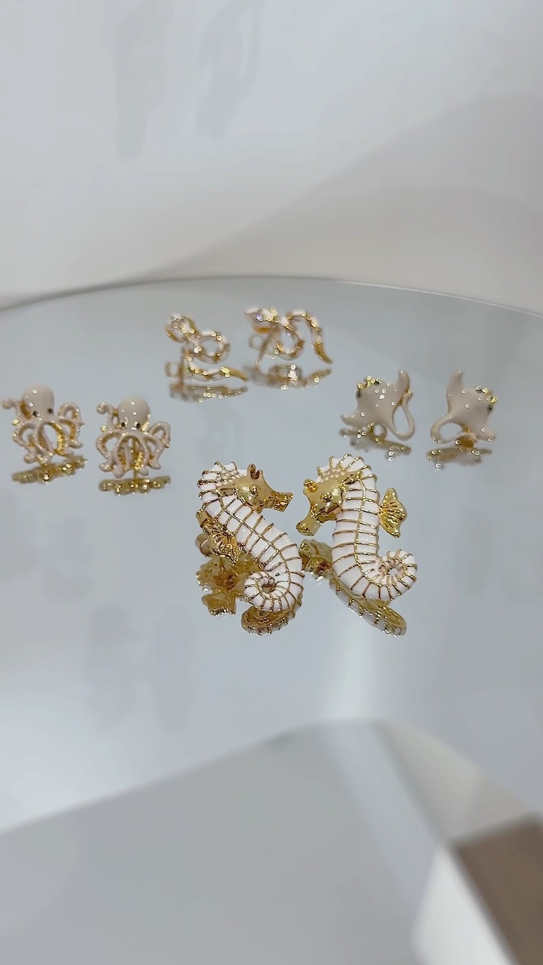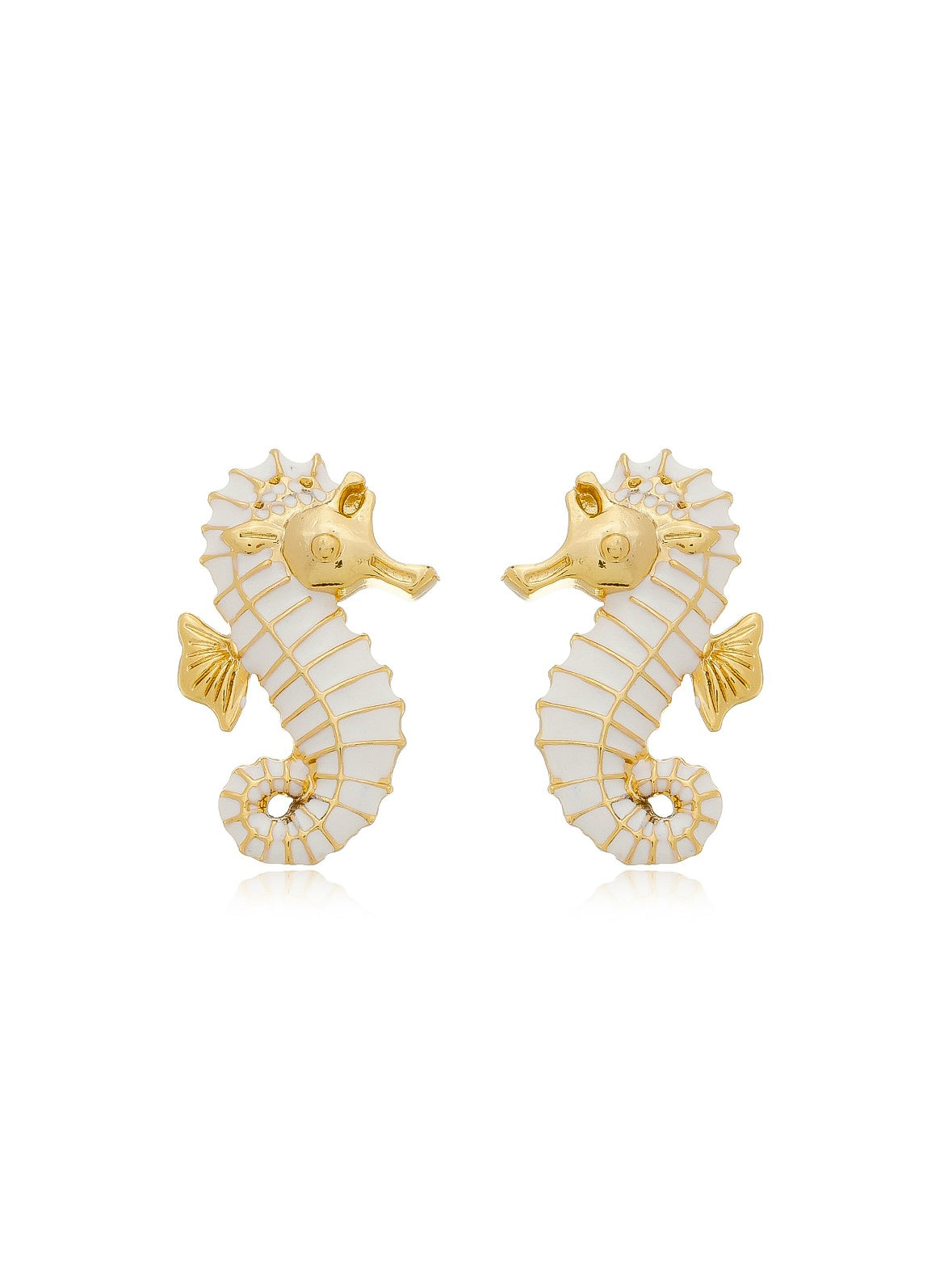 The Caspian Ivory earrings feature whimsical seahorses beautifully crafted in warm gold with white enamel enhancing their natural curves and creating a stunning contrast.