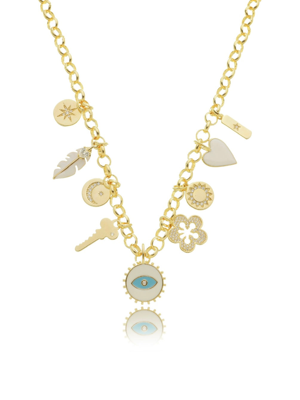 Exclusive to the Azulique collection, this necklace is made by Brazilian artisans. An explosion of cuteness with a series of charms that include a sparkly flower, heart, key and a Greek eye for protection against negative energy.