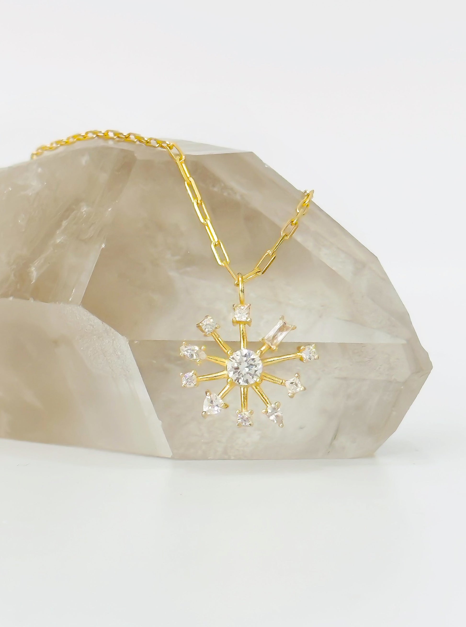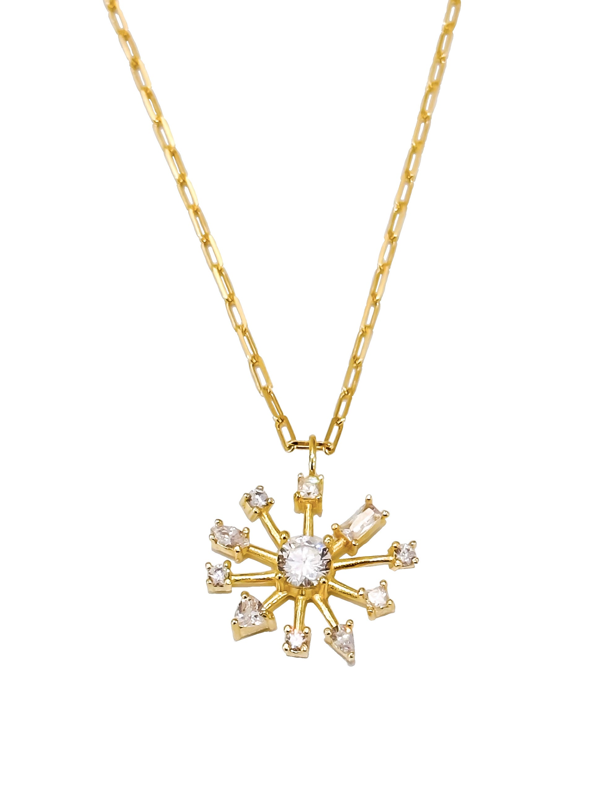 Exclusive to the Azulique collection, the Estelar necklace is completely handmade by Brazilian artisans. Made of sterling silver with high quality 18k gold bath and asymmetrical cubic zirconia stones placed entirely by hand, this dazzling necklace is a burst of sparkle for your decote.
