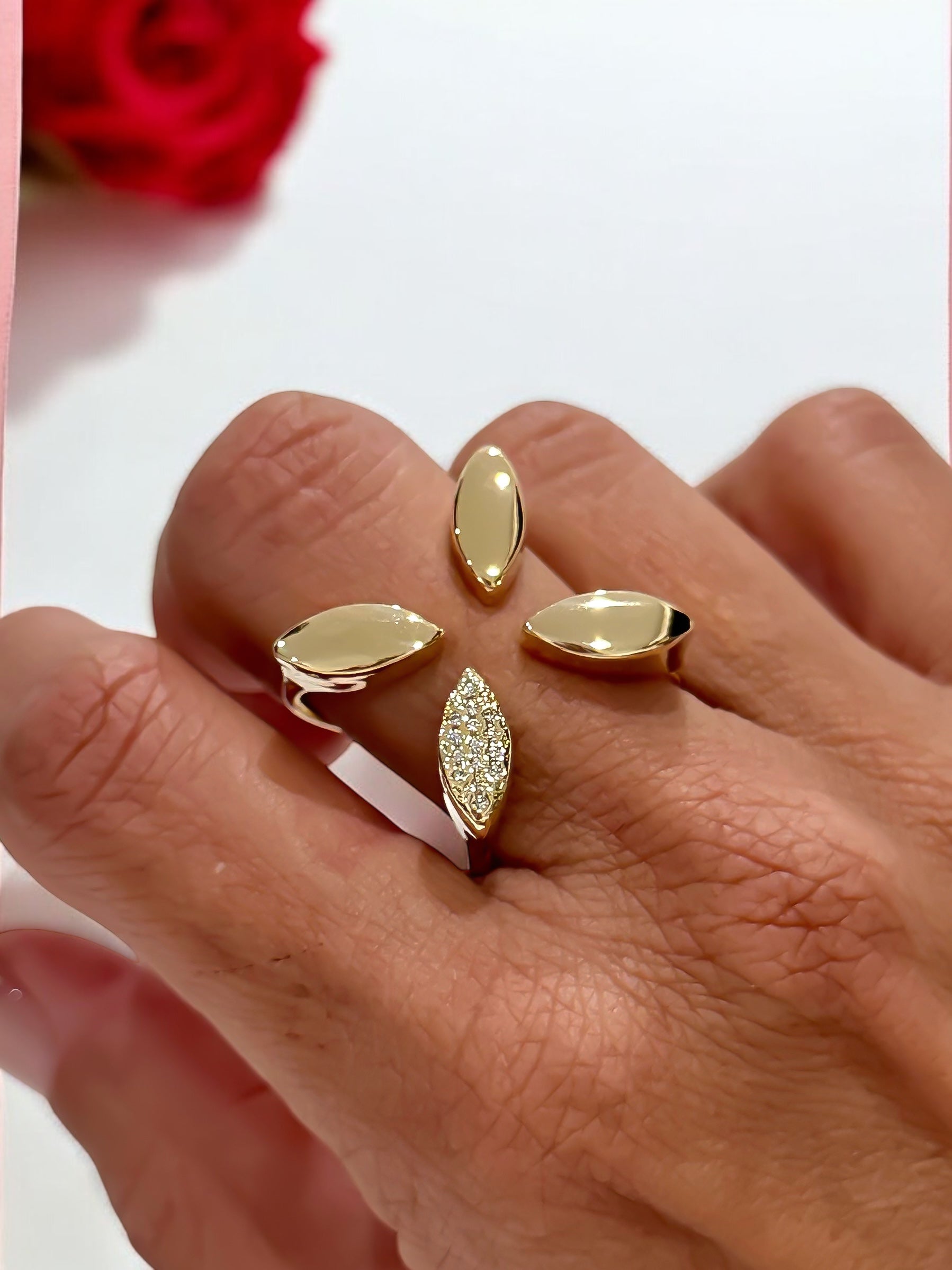 This open-shaped flower petal crystal ring is a delicate and modern take on nature-inspired jewelry. The Lotus ring features a beautifully crafted flower with soft, flowing petals, each one gently curving to create an open, airy design. One of the petals is covered in crystals catching the light with every movement and adding a touch of subtle glamour. The open design allows the ring to wrap gracefully around the finger, offering a sense of fluidity and elegance.
