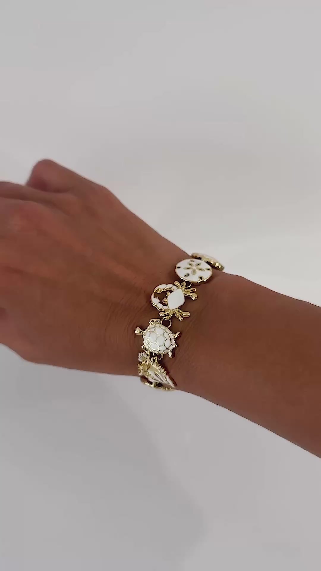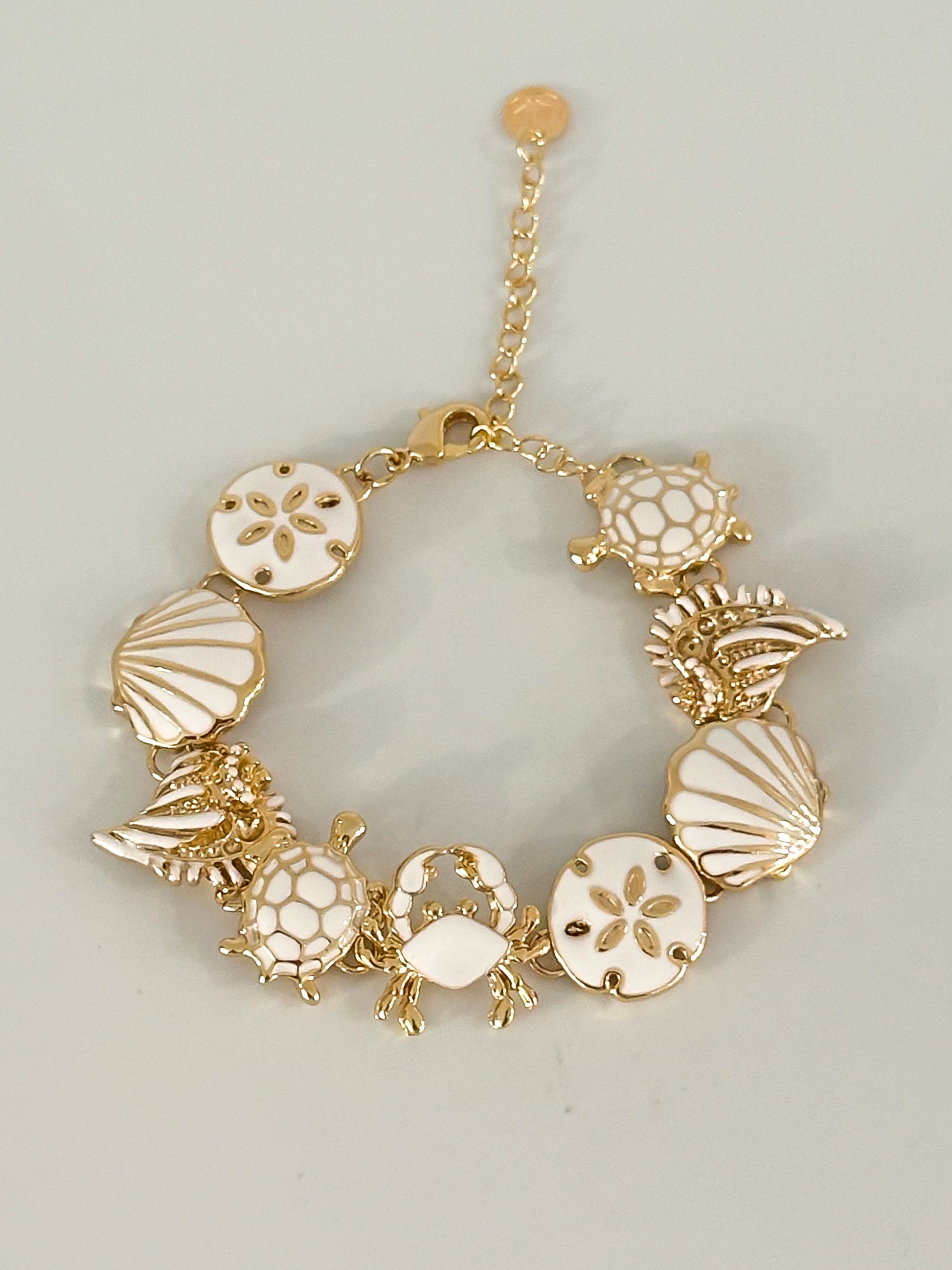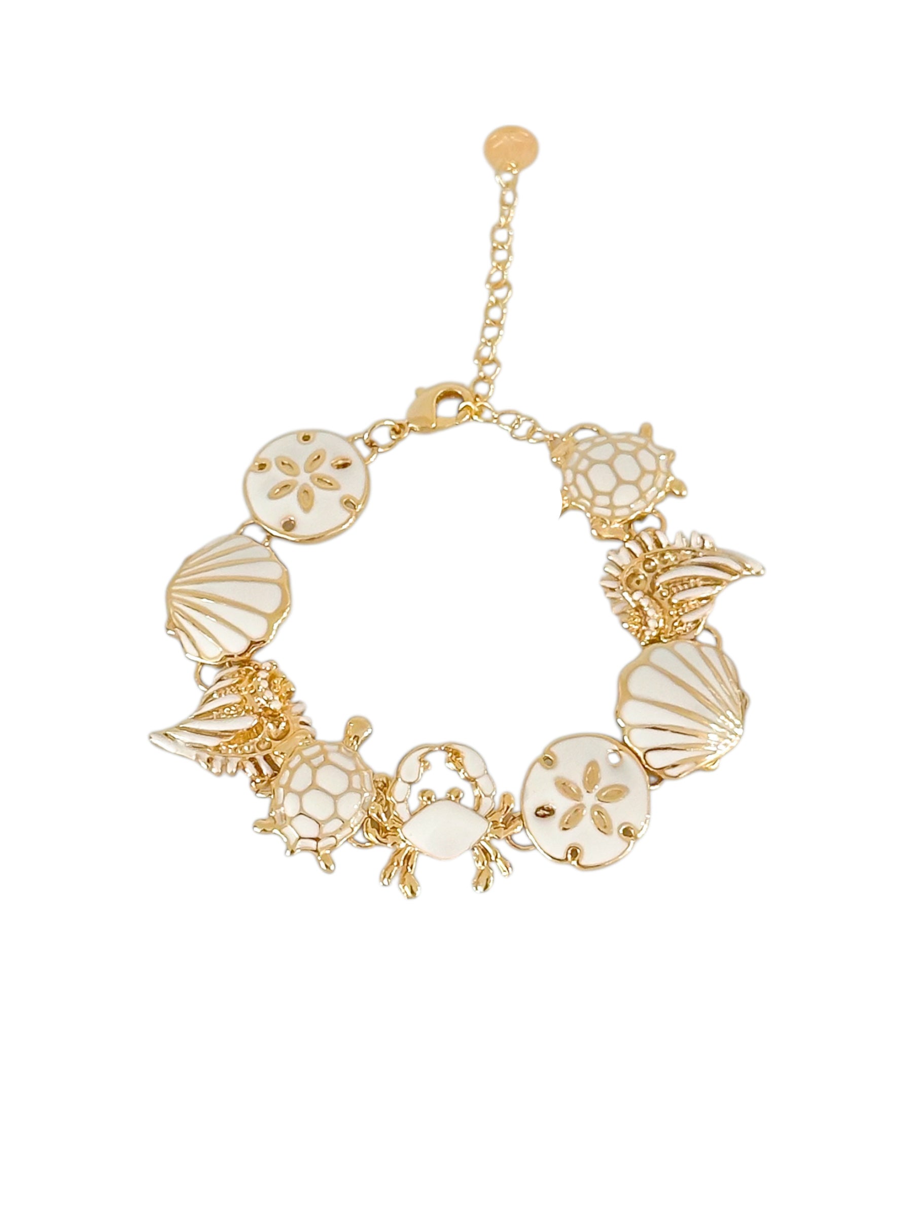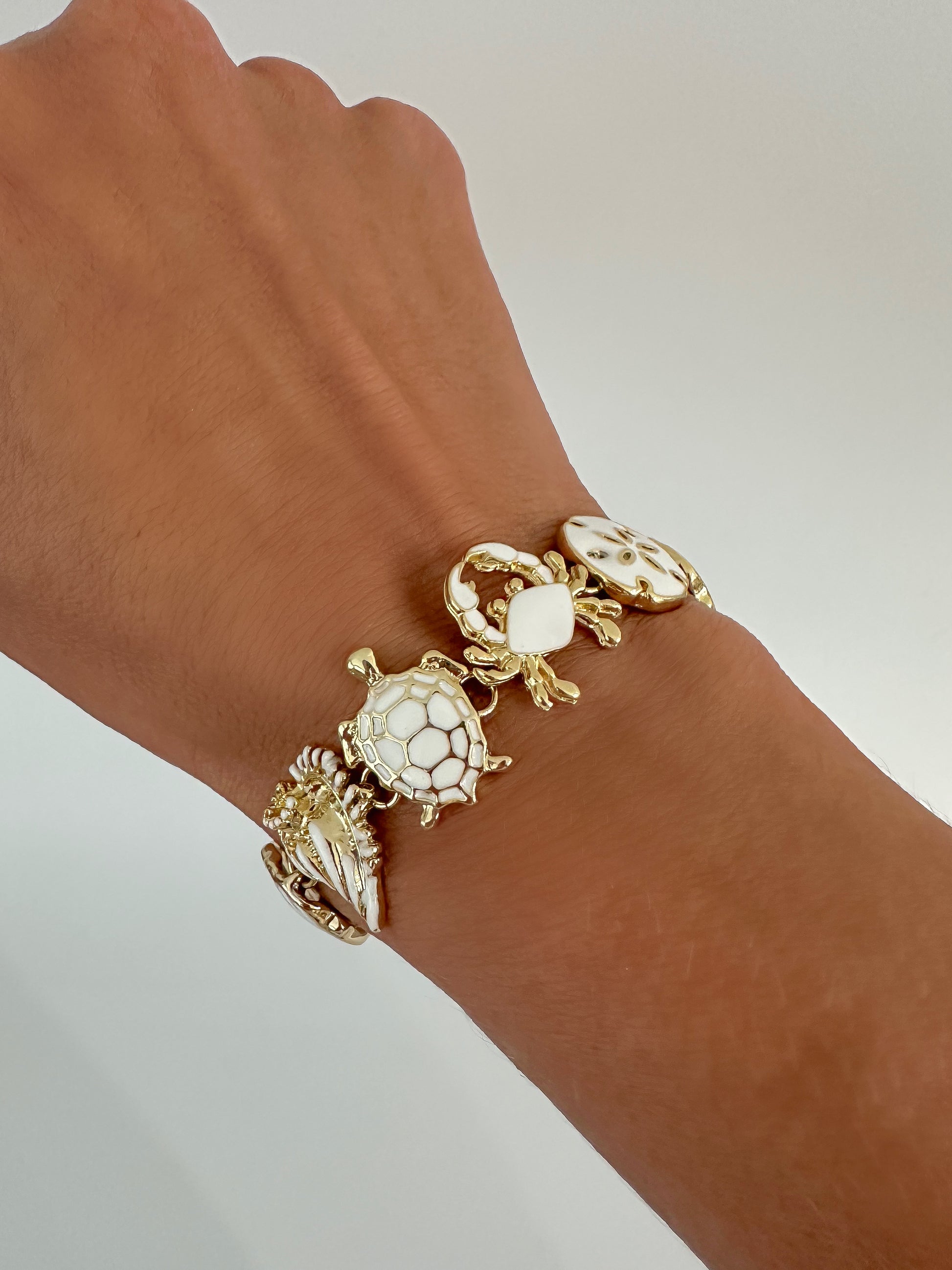 The Oceanna bracelet showcases a captivating sea motif, bringing together an array of marine-inspired elements. The design features octopus alongside seashells, stingrays, crabs, and starfish, each carefully crafted with enamel accents to evoke the beauty of the ocean.