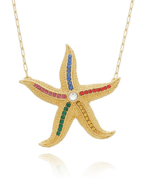 Sereia means Mermaid in Portuguese and that's how you will feel with this necklace on! This necklace features a bold starfish pendant adorned with a vibrant array of colorful crystals. The starfish's intricate design is beautifully complemented by the radiant gold finish, creating a dazzling, eye-catching piece.